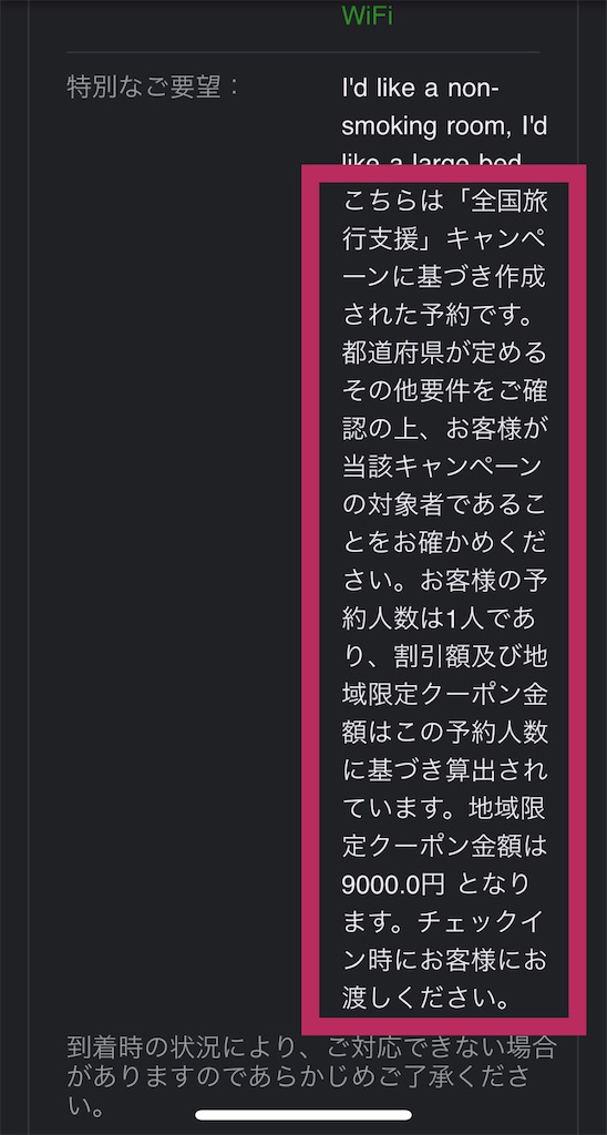 1泊に付き3000円のクーポンが受け取れるはずですがチェックイン時に受け取れる事が記載されています。宿泊費用の方の割引は決済時に適用されています。